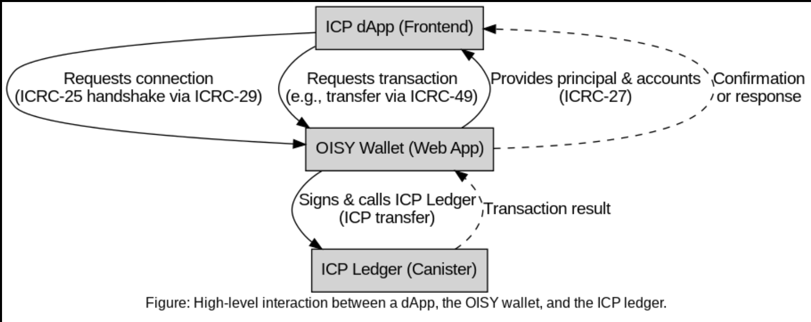 In Simple Words: When your dApp connects to OISY, they start talking using a method defined by ICRC-29. Your dApp asks for permission to interact (ICRC-25). If granted, OISY provides the user's identity details (ICRC-27). When your dApp wants to perform an action like a transfer, it sends a request to OISY (ICRC-49). OISY then shows a clear, human-readable confirmation message to the user (ICRC-21) asking for their approval before proceeding.